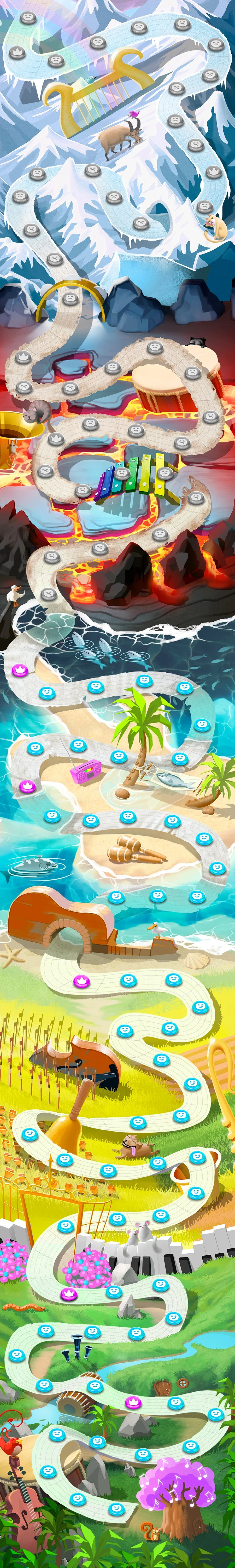 Melody Monsters is a match-three-type mobile game that was developed fully but never published. My responsibilities were the map background, marketing art and I also did a bunch of concepts for the match-three elements.